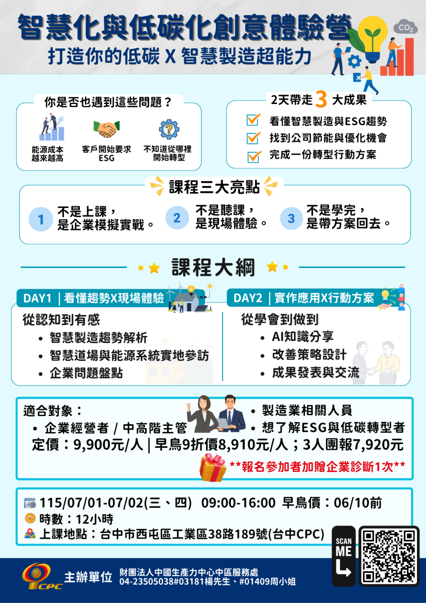 在全球淨零碳排與ESG趨勢加速推動下,企業正面臨能源成本上升、供應鏈減碳要求與轉型壓力等多重挑戰。為協助企業掌握智慧製造與低碳轉型關鍵,推出「智慧化與低碳化創意體驗營」,透過2天沉浸式體驗與實作,引導學員從理解趨勢到實際行動,打造企業轉型新動能。