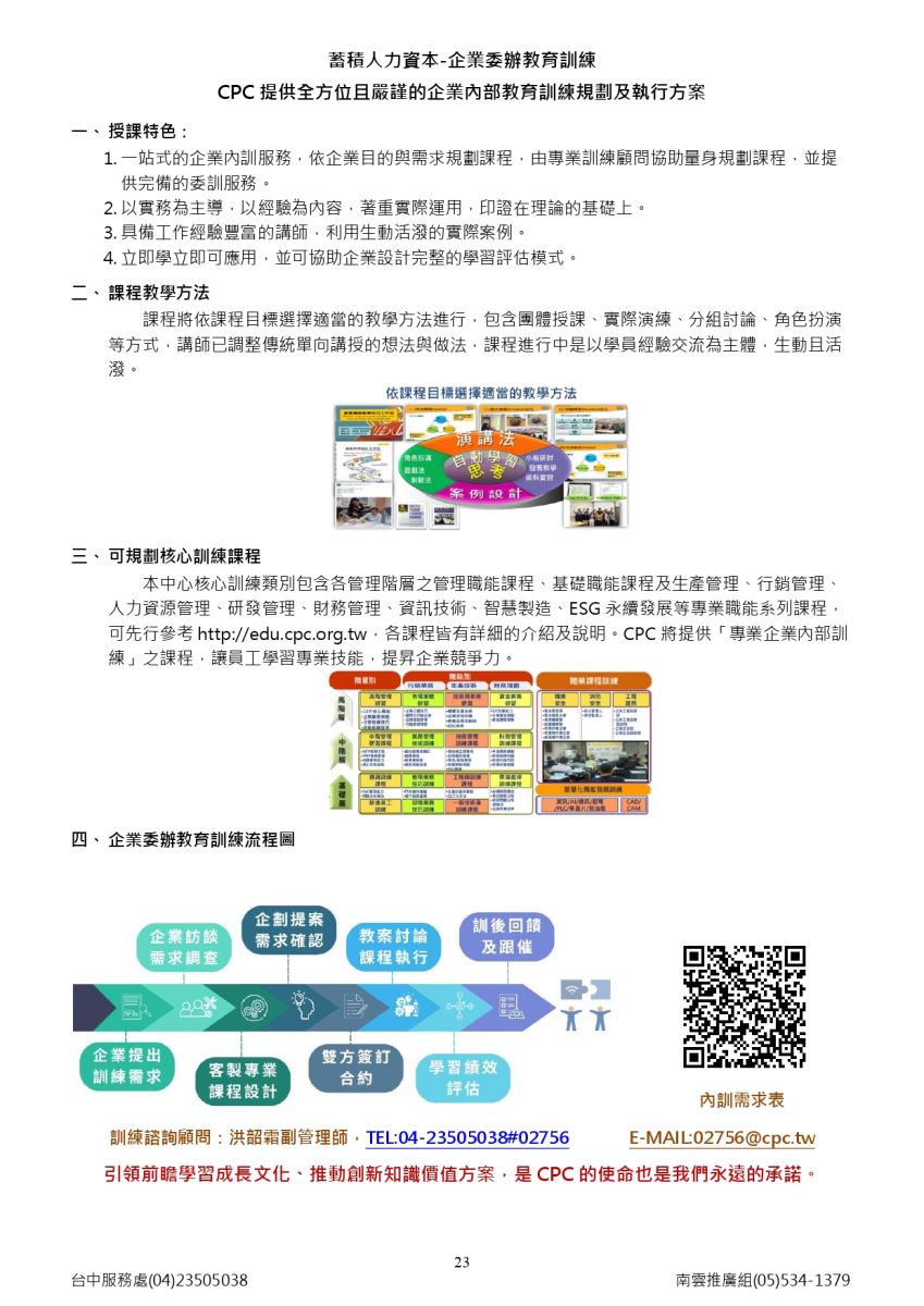 客製化企業內訓服務-量身訂做專屬企業培訓課程提升人才力 2024/12/31 17:31 企業內訓服務 ★ 貴公司可以挑選中國生產力中心中區服務處網站上的課程,網頁上的課程皆可邀請老師至貴公司授課,辦理企業內部訓練。 課程內容我們也提供客製化設計,依照貴公司需求幫貴公司設計新課程。 企業內訓服務聯繫詢問請洽諮詢顧問: 中區服務處經營管理組 洪韶霜小姐 Tel:04-2350-5038 Ext.02756 email: 02756@cpc.tw