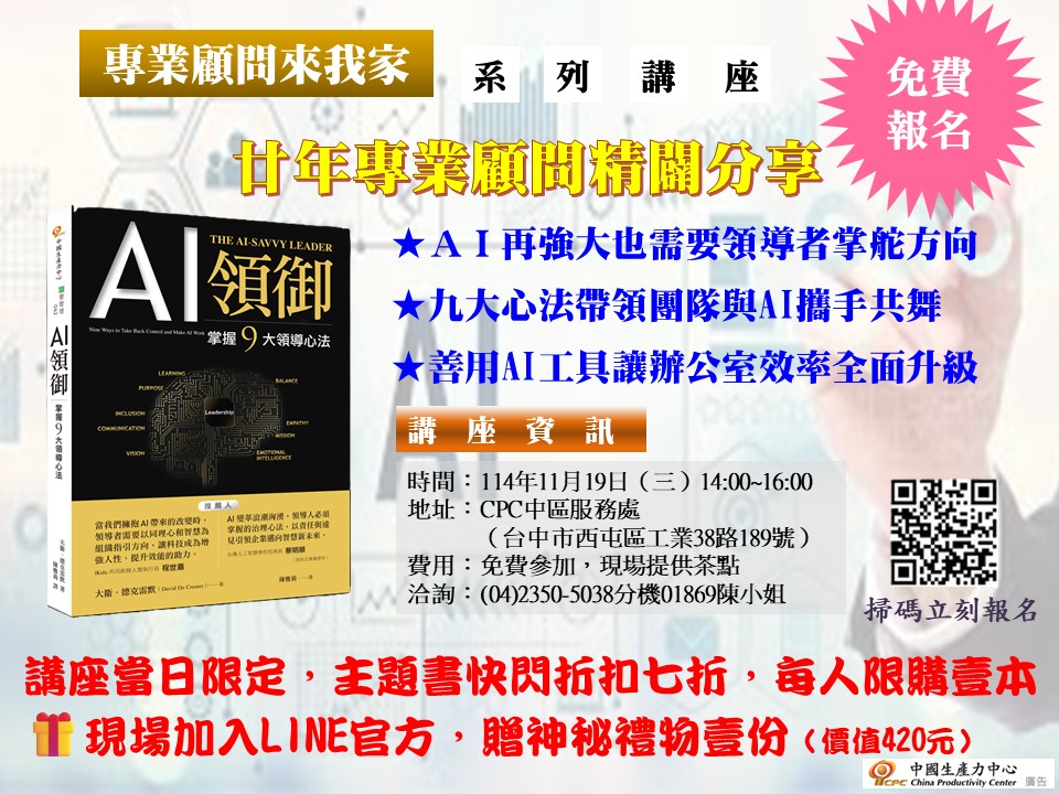 好康一:講座當日限定,主題書「AI領御」快閃折扣七折,每人限購壹本